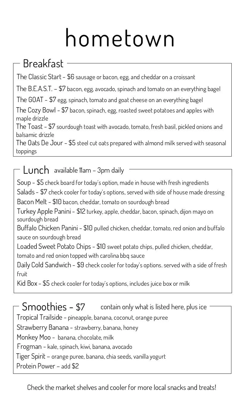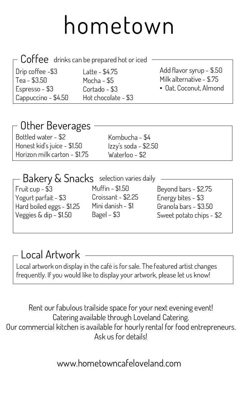Nestled along the Little Miami Scenic Trail in historic downtown Loveland, Hometown cafe is the perfect spot for a relaxing break. Savor coffee and espresso brewed with locally roasted Deeper Roots beans. Enjoy a made-to-order breakfast sandwich. Refuel with a real fruit and veggie smoothie. Fill up with from-scratch soup, salad, or sandwich. The cafe is stocked with local treats, snacks and products like cookies, candy, lotion, and energy bars & bites. Kitchen rental is available for makers who need a commercial kitchen to produce their goods. After the café closes, Hometown holds special events like kitchen takeovers and is available for event rental.